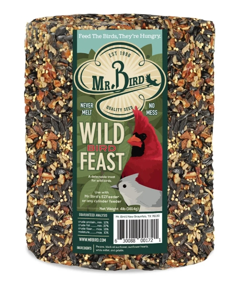 An amazing variety of birds visit the WildBird Feast. In addition to the regular feeder birds such as; Cardinals, chickadees, woodpeckers, nuthatches, finches, and titmice, we have reports of various warblers, wrens, kinglets, mockingbirds, and even bluebirds eating these cylinders. No waste, no mess, never melt.